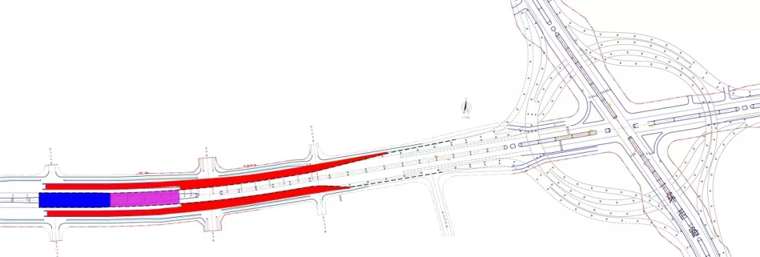 首先在立交橋兩側(cè)新建兩條上下橋匝道(圖中紅色部分),滿足施工期間車輛正常通行。第二步再進行現(xiàn)狀引橋拆除(圖中藍色部分),最后進行頂升施工(圖中玫紅色部分)。