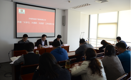 2018年4月9日,濟(jì)南西城資產(chǎn)管理有限公司組織召開(kāi)“大學(xué)習(xí)、大調(diào)研、大改進(jìn)”工作動(dòng)員大會(huì)。會(huì)議由資產(chǎn)公司副總經(jīng)理?xiàng)罾ね局鞒植⑿x《濟(jì)南西城資產(chǎn)管理有限公司開(kāi)展“大學(xué)習(xí)、大調(diào)研、大改進(jìn)”工作實(shí)施方案》,副總經(jīng)理陳向勤同志宣讀《濟(jì)南城市建設(shè)集團(tuán)創(chuàng)建全國(guó)文明單位工作方案》,董事長(zhǎng)兼總經(jīng)理顏丙根同志就以上工作作動(dòng)員講話。