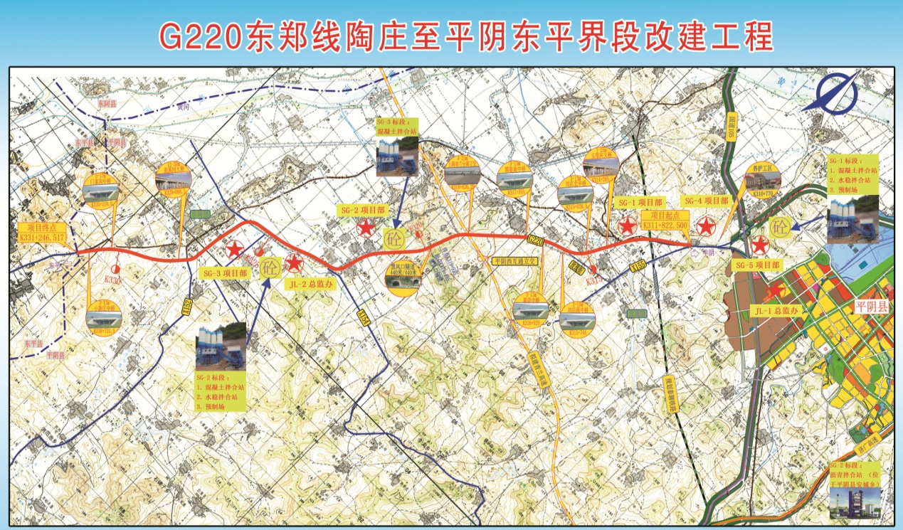 G220東鄭線陶莊至平陰東平界段改建工程項(xiàng)目位于濟(jì)南市平陰縣境內(nèi),路線全長19.424km,其中利用原路改建段16.635公里,新建段2.789公里。全線設(shè)大橋2座、中橋6座、小橋3座、涵洞53道、隧道440米/1座、分離立交1座,新建養(yǎng)護(hù)工區(qū)1處。全線采用雙向四車道一級公路標(biāo)準(zhǔn),設(shè)計(jì)速度80公里/小時(shí),路基寬度一般路段為24.5米;東阿鎮(zhèn)路段路基寬37米,設(shè)置非機(jī)動(dòng)車道;隧道進(jìn)出口分離路基路段路基寬12.25米,批準(zhǔn)概算6.54億元,計(jì)劃總工期579天。