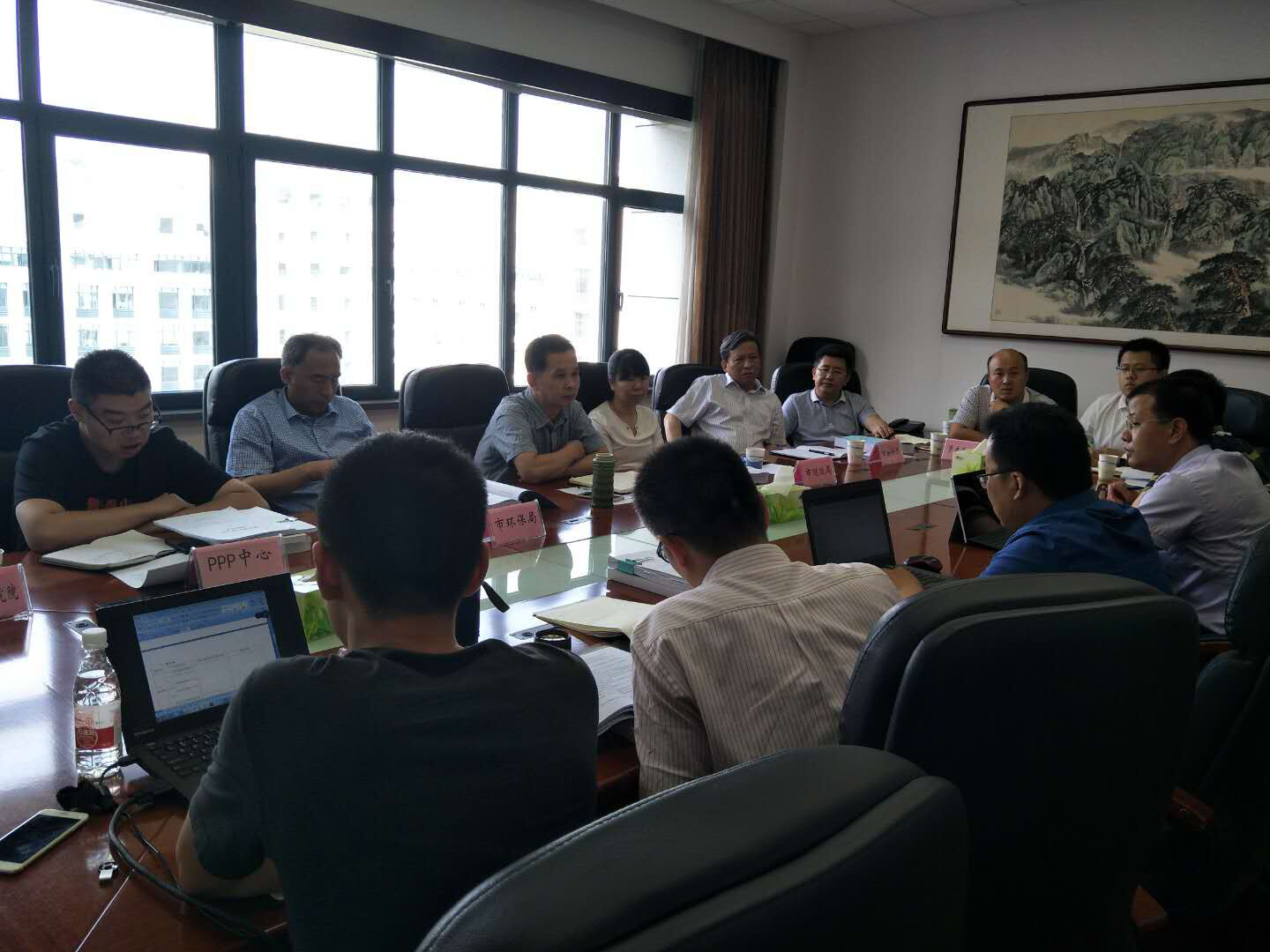 圖一、市城鄉(xiāng)水務(wù)局副巡視員朱丹彤、排水處處長(zhǎng)湯啟剛、市財(cái)政、物價(jià)、環(huán)保局等有關(guān)單位與公司總經(jīng)理李少成一同與社會(huì)資本預(yù)中標(biāo)人談判。