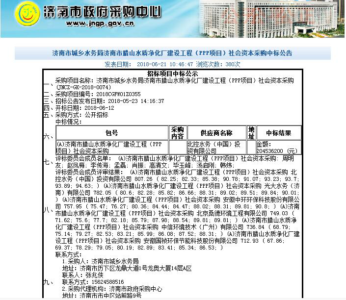 2018年6月14日-22日,按照市城鄉(xiāng)水務(wù)局要求,資產(chǎn)運(yùn)營(yíng)公司參加臘山水質(zhì)凈化廠ppp項(xiàng)目預(yù)中標(biāo)社會(huì)資本談判會(huì),按照政府采購(gòu)中心要求與前三名中標(biāo)人進(jìn)行會(huì)談,按程序最終確定成績(jī)第一名的北控水務(wù)(中國(guó))投資有限公司中標(biāo)。21日濟(jì)南市政府采購(gòu)中心開(kāi)始進(jìn)行中標(biāo)公示,22日資產(chǎn)運(yùn)營(yíng)召專題研究會(huì),與北控水務(wù)就合作協(xié)議、公司章程相關(guān)內(nèi)容與條款進(jìn)行討論,研究部署組建ppp公司相關(guān)工作,倒排工期,壓茬推進(jìn)各項(xiàng)前期工作。