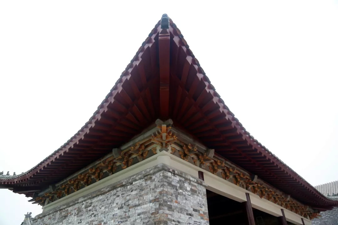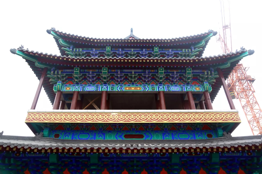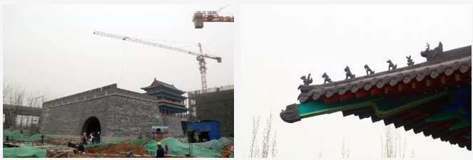 項(xiàng)目所有建筑中,城門樓是工程量最大、工期最長(zhǎng)的單體建筑,其中,城墻全部采用手工磚砌筑,經(jīng)過人工修整后的磚塊古樸素雅,并無過分雕飾痕跡。進(jìn)入城門樓內(nèi)部,柱與梁之間均為傳統(tǒng)木質(zhì)斗拱支撐,城門樓的彩繪部分尤為明亮突出,采用的是旋子彩繪形式,一般經(jīng)過6道工序,一平方米的彩繪需要一名繪畫師傅耗時(shí)約半天一次成型。