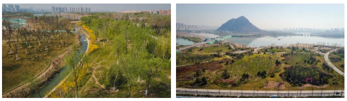 園區(qū)在設(shè)計(jì)建設(shè)時(shí)注重區(qū)分功能性和體驗(yàn)性,華山北面部分定位為濕地展示區(qū),展示濕地的景觀特性,融合體驗(yàn)式科教,綠化景觀多為豐富層疊狀,各類(lèi)植物栽種交錯(cuò)有致,層次豐富,移步至華山東面及東南面,這片區(qū)域定位為山林文娛區(qū),結(jié)合北臥牛山和驢山形成特色山林景觀,靠近山體部分的植物景觀結(jié)構(gòu)上則多以大開(kāi)大合景觀為主,大片草地開(kāi)闊寬廣,風(fēng)格迥異,賞玩別有趣味。