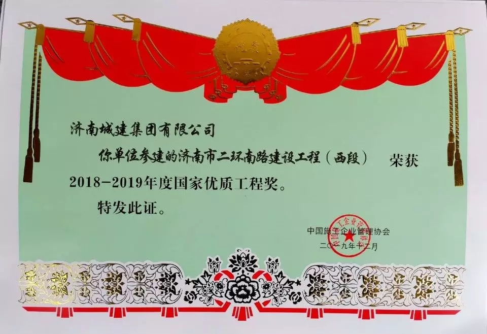 近日,中國施工企業(yè)管理協(xié)會在國家會議中心召開“2019年國家優(yōu)質(zhì)工程獎總結(jié)表彰大會”,來自工程建設領域的各關聯(lián)協(xié)會及建設、勘察、設計、施工、監(jiān)理等700余家單位的1500名代表參加了會議。由濟南城市建設集團所屬濟南黃河路橋建設集團有限公司、濟南城建集團有限公司分標段承建的濟南市二環(huán)南路建設工程(西段)榮獲“2018-2019年度國家優(yōu)質(zhì)工程獎”。