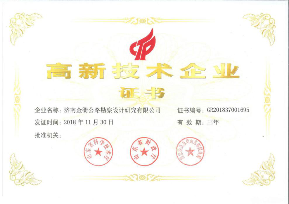 2019年3月14日,金衢公司喜獲由山東省科學技術(shù)廳、山東省財政廳、山東省國家稅務(wù)局和山東省地方稅務(wù)局聯(lián)合頒發(fā)的高新技術(shù)企業(yè)證書,這標志著金衢公司正式邁入國家級高新技術(shù)企業(yè)行列。
