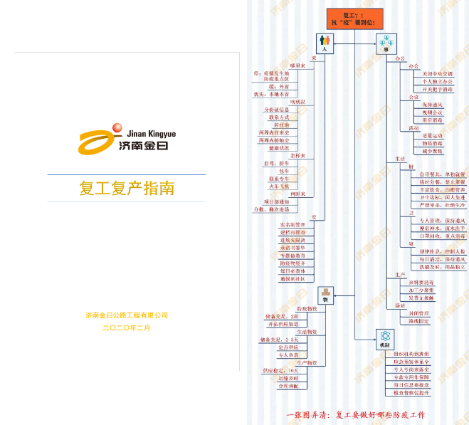 復(fù)工,要做些什么,該怎樣做?金曰公司通過一份指南明確要求,通過一張導(dǎo)圖防控部署。公司防控領(lǐng)導(dǎo)小組迅速傳達(dá)落實(shí)上級黨委工作部署,一手抓疫情防控,一手抓復(fù)工復(fù)產(chǎn),提出復(fù)工復(fù)產(chǎn)的基本要求、指導(dǎo)意見。職能部門繪制思維導(dǎo)圖,對人員如何來、怎樣保安全,做哪些準(zhǔn)備工作,體制機(jī)制的健全,辦公、生活、生產(chǎn)等防疫要點(diǎn),加以明確,一目了然。