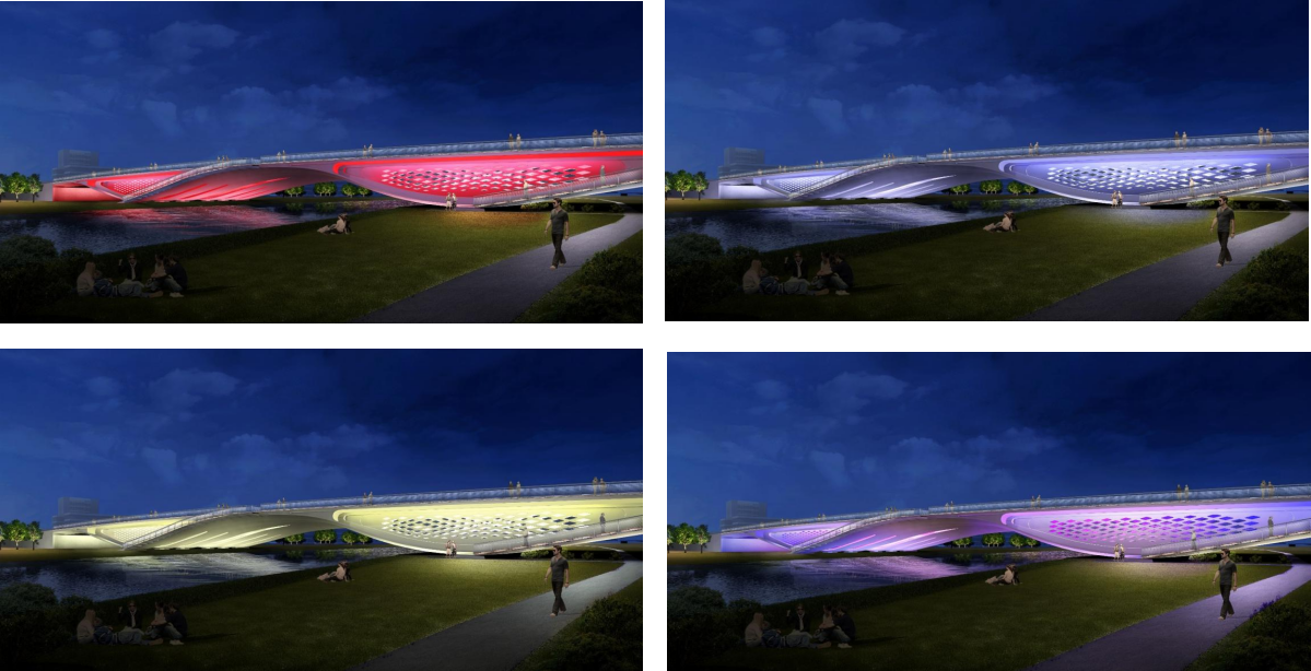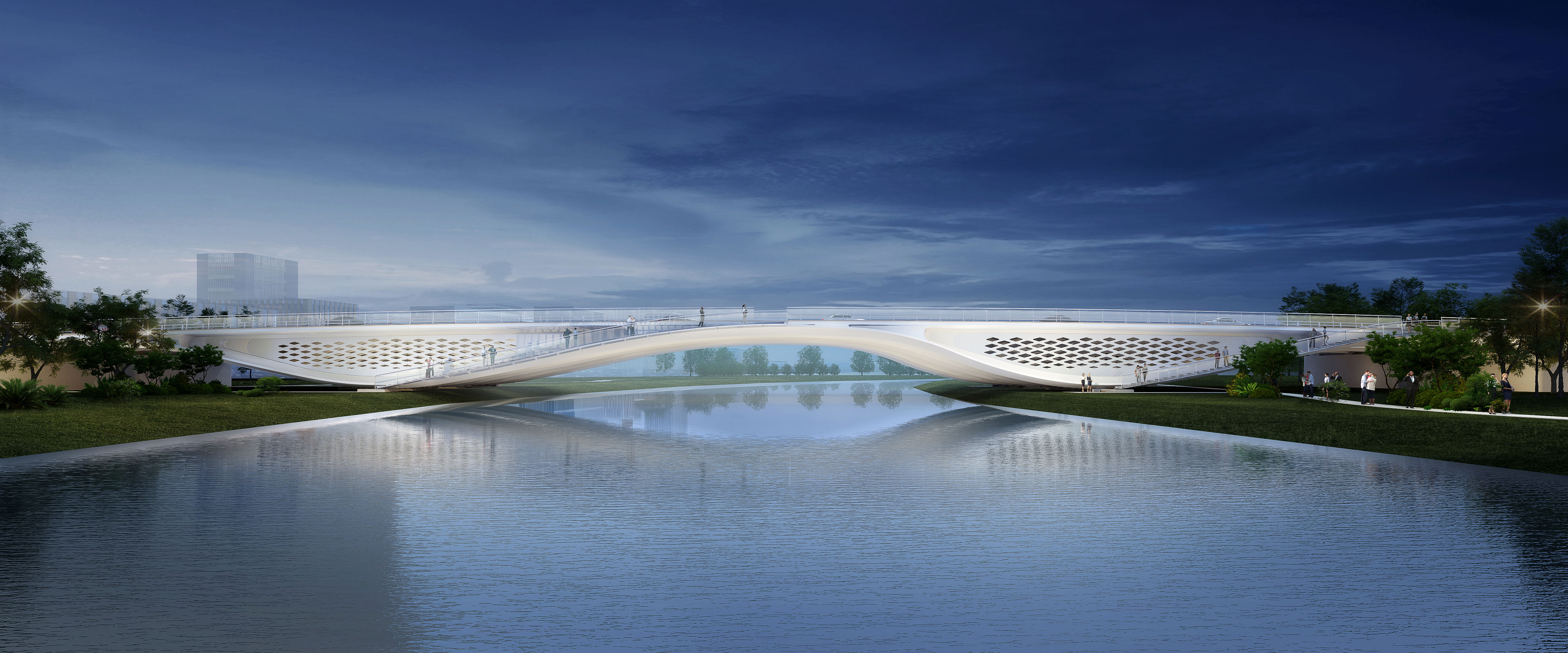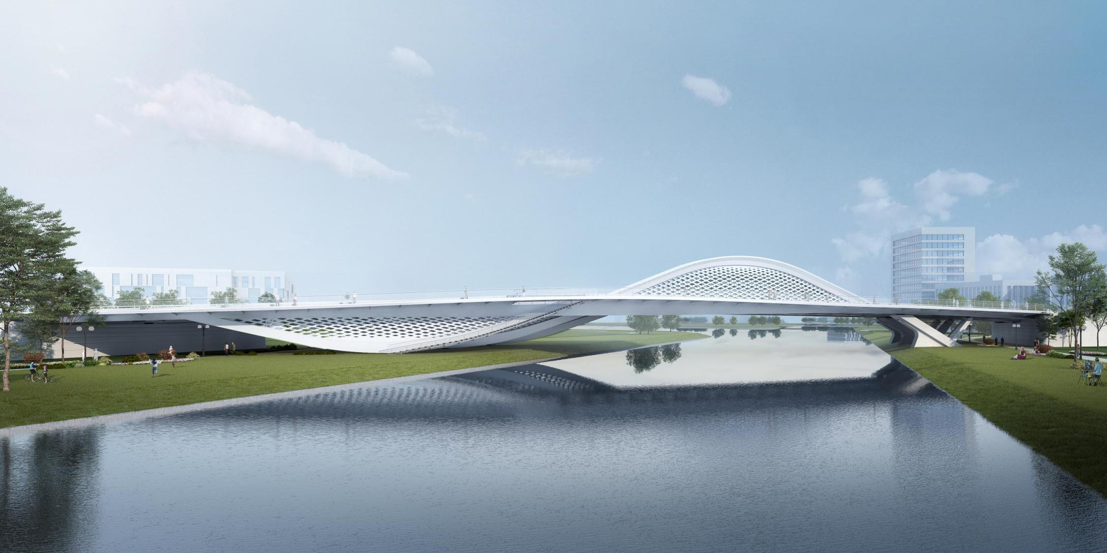 橫一路、橫二路大寺河橋作為起步區(qū)規(guī)劃的第一批景觀橋梁,由濟(jì)南城市建設(shè)集團(tuán)有限公司受委托建設(shè),兩座橋梁由世界著名橋梁設(shè)計師Marc MIMRAM先生主設(shè)計,通過研究濟(jì)南的歷史和文化,以泉與太極這個設(shè)計為根基,將泉城的剛中有柔、柔中帶剛,與太極互為印證,力與美相結(jié)合,完成兩座景觀橋梁的設(shè)計。