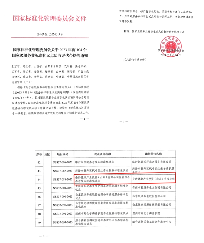 近日,根據(jù)《關(guān)于推進(jìn)服務(wù)標(biāo)準(zhǔn)化試點(diǎn)工作的意見》(國(guó)標(biāo)委農(nóng)聯(lián)[2007]7號(hào))和《服務(wù)業(yè)標(biāo)準(zhǔn)化試點(diǎn)實(shí)施細(xì)則》(國(guó)標(biāo)委服務(wù)聯(lián)[2009]47號(hào)),經(jīng)對(duì)國(guó)家級(jí)服務(wù)業(yè)標(biāo)準(zhǔn)化試點(diǎn)項(xiàng)目評(píng)估總結(jié)材料進(jìn)行審核,國(guó)家標(biāo)準(zhǔn)化管理委員會(huì)確定2023年度104個(gè)國(guó)家級(jí)服務(wù)業(yè)標(biāo)準(zhǔn)化試點(diǎn)項(xiàng)目驗(yàn)收評(píng)估合格,建設(shè)集團(tuán)所屬金齡健康產(chǎn)業(yè)投資(山東)有限公司醫(yī)養(yǎng)結(jié)合養(yǎng)老服務(wù)標(biāo)準(zhǔn)化試點(diǎn)通過驗(yàn)收。